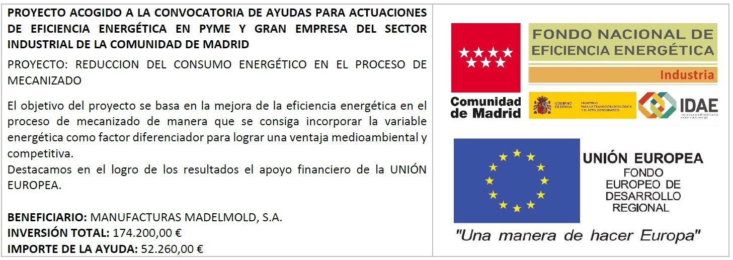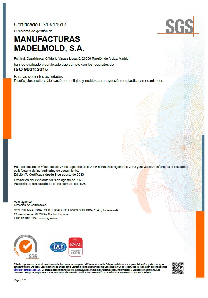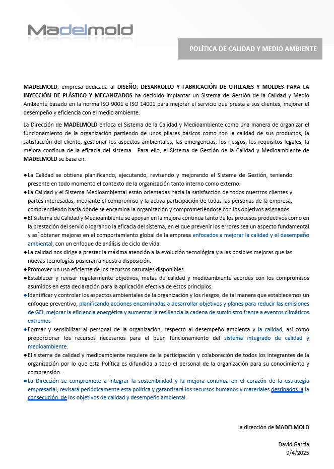 MADELMOLD, empresa dedicada al DISEÑO, DESARROLLO Y FABRICACIÓN DE UTILLAJES Y MOLDES PARA LA INYECCIÓN DE PLÁSTICO Y MECANIZADOS ha decidido implantar un Sistema de Gestión de la Calidad y Medio Ambiente basado en la norma ISO 9001 e ISO 14001 para mejorar el servicio que presta a sus clientes, mejorar el desempeño y eficiencia con el medio ambiente.